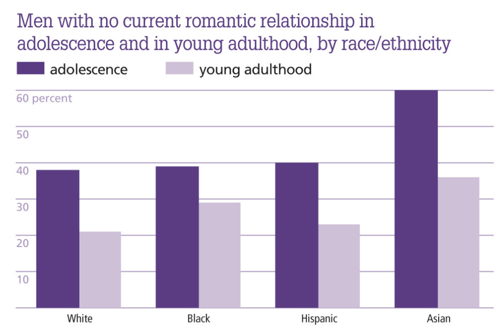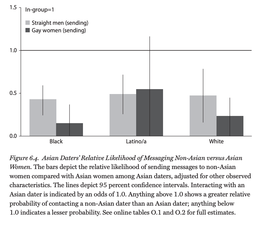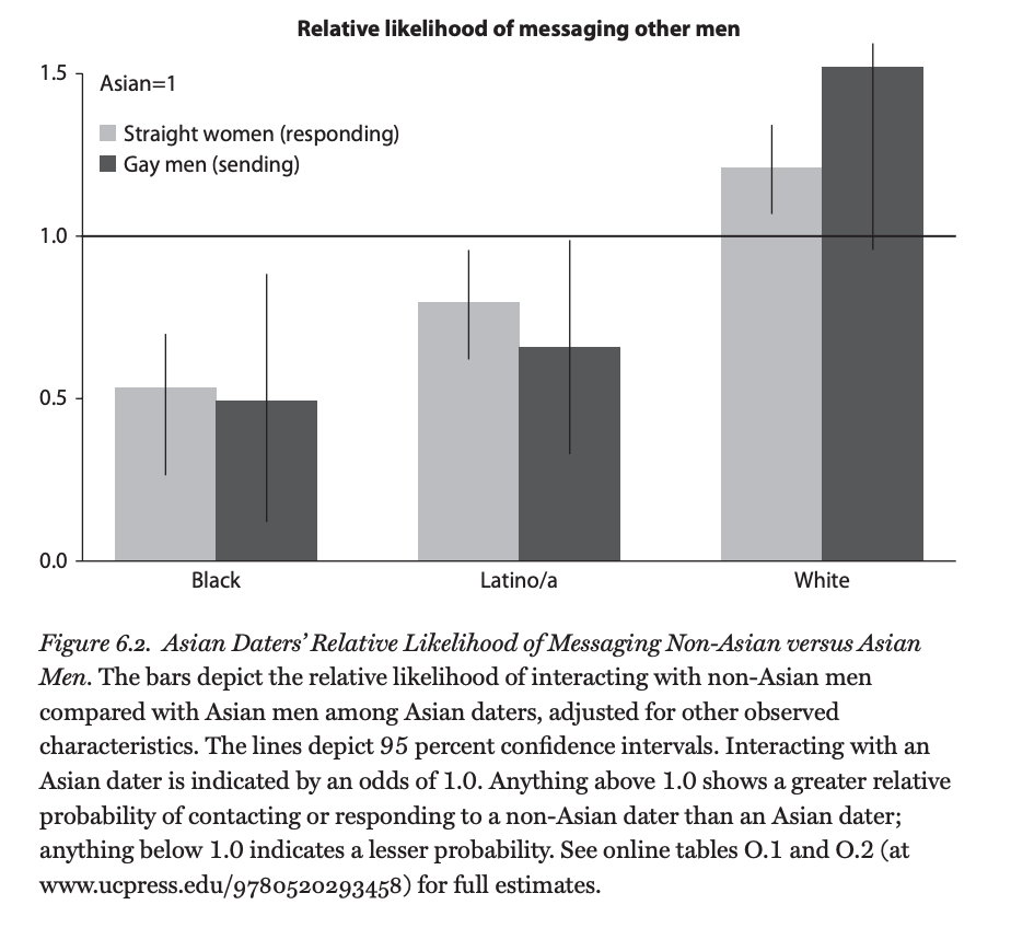 An entire mountain of empirical evidence supports Harveyâs crude assertion. A 2014 study by Christian Rudder, the co-founder of OkCupid, showed that Asian men are the least desirable racial group to women. A study by the University of Chicago revealed that Asian men received the fewest unsocialized messages on dating apps relative to any other ethno-racial group. Another study showed that among non-Asian women, 90 percent of non-Asian women excluded Asian men from their dating preferences. Even Asian women are not immune to this phenomenon, nor the perceptions of Asian men that lead Americans at large to have that preference. A book published by the UC Berkeley Press called The Dating Divide: Race and Desire in the Era of Online Romance, showed that Asian women were more likely to respond to messages sent by White men than those sent by Asian men